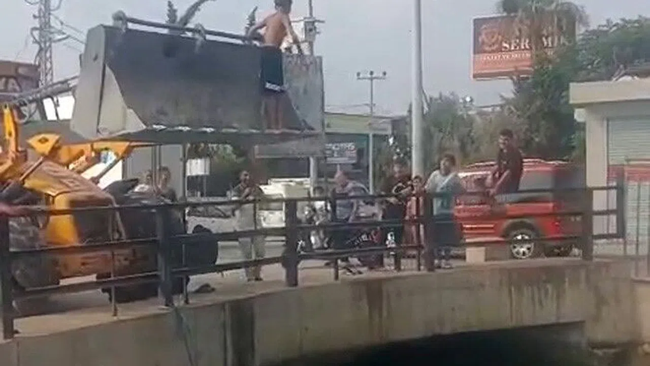 Adana'da bunaltan sıcakta serinlemek isteyen çocukların iş makinesine çıkıp sulama kanalına atlaması tehlike oluşturdu.