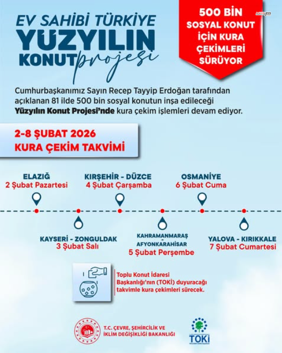 Murat Kurum, Yüzyılın Konut Projesi kapsamında yapılacak yeni kura çekimlerinin tarih ve şehir takvimini de paylaştı. Açıklanan programa göre, 500 bin sosyal konut için kura süreci 2–8 Şubat 2026 tarihleri arasında 10 ili kapsayacak şekilde gerçekleştirilecek.