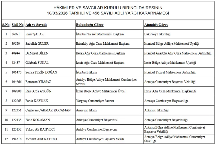 Yapılan atamalara göre, İstanbul Ticaret Mahkemesi Başkanı Pınar Şafak Bakırköy Hakimliğine atanırken, Bakırköy Ağır Ceza Mahkemesi Başkanı Sadullah Güler İstanbul Bölge Adliye Mahkemesi üyeliğine getirildi. Bursa Ağır Ceza Mahkemesi Başkanı Dr. Mesut Bilen İstanbul Anadolu Ağır Ceza Mahkemesi Başkanlığına atanırken, İzmir Ağır Ceza Mahkemesi Başkanı Gökberk Sunal İzmir Bölge Adliye Mahkemesi üyeliğine geçti.