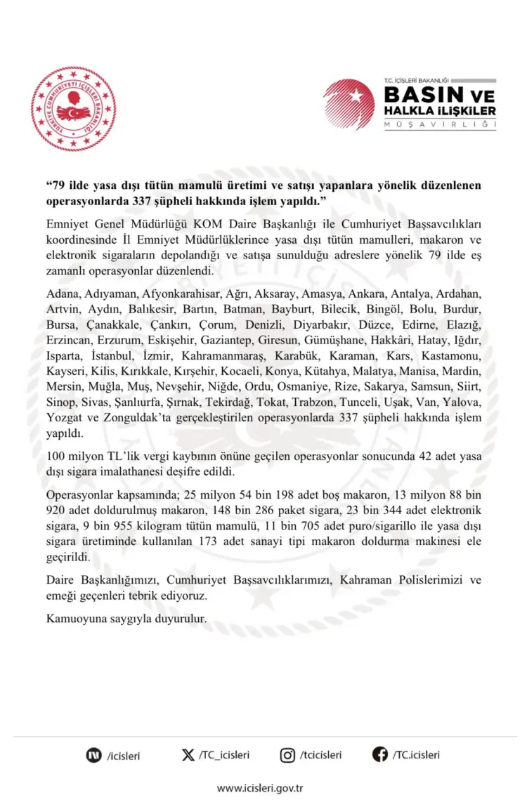 İçişleri Bakanlığı, yasa dışı tütün mamulü üretimi ve satışına yönelik 79 ilde eş zamanlı operasyonlar düzenlendiğini açıkladı.