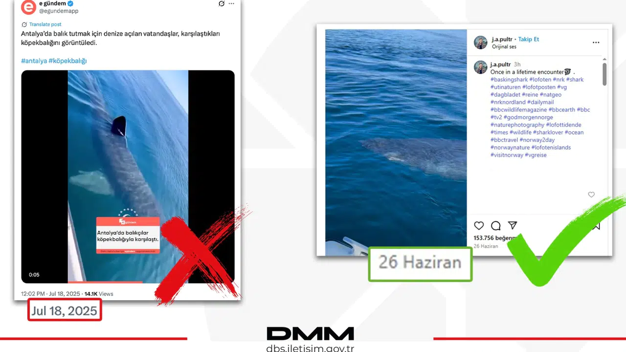 İletişim Başkanlığı Dezenformasyonla Mücadele Merkezi (DMM), sosyal medyada Antalya sahillerinde köpekbalığı görüldüğü iddiasıyla paylaşılan bir videonun dezenformasyon olduğunu duyurdu.
