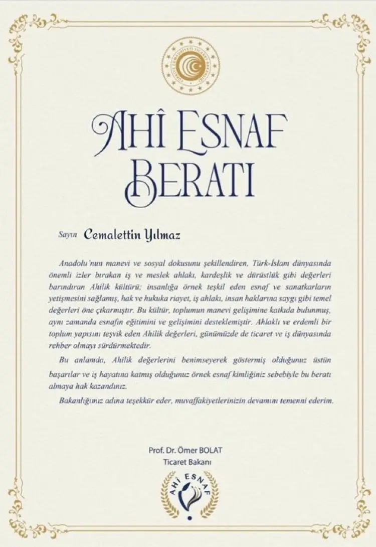 Esnaf Yılmaz'ın, Pakistanlı aileye 'Pakistanlı kardeşlerimiz Kurtuluş Savaşı'nda destek olmuştu, sizden ücret almam' sözleriyle yaklaşmasının büyük bir vefa örneği olduğunu belirten Bakan Bolat, bu davranışın geçmişe duyulan minnetin bugün de yaşatıldığını gösterdiğini ifade etti. Ticaret Bakanlığı tarafından İstanbul'da düzenlenen törende Yılmaz'a takdim edilen Ahi Esnaf Beratı'nın, ticarette dürüstlük, güven ve kardeşlik anlayışının bir simgesi olduğu kaydedildi.