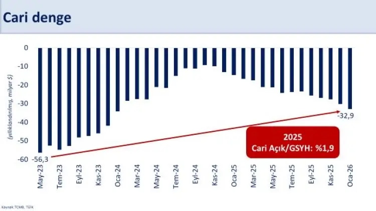 Hazine ve Maliye Bakanı Mehmet Şimşek, Ocak ayı cari işlemler verilerine ilişkin yaptığı değerlendirmede yıllık cari açığın 32,9 milyar dolar seviyesinde gerçekleştiğine dikkati çekerke, sosyal medya hesabından açıklamalarda bulundu.