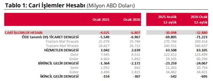 Türkiye Cumhuriyet Merkez Bankası (TCMB), 2026 yılı Ocak ayına ilişkin ödemeler dengesi istatistiklerini açıkladı. Buna göre, Ocak ayında cari işlemler hesabı 6 milyar 807 milyon ABD doları açık verdi.