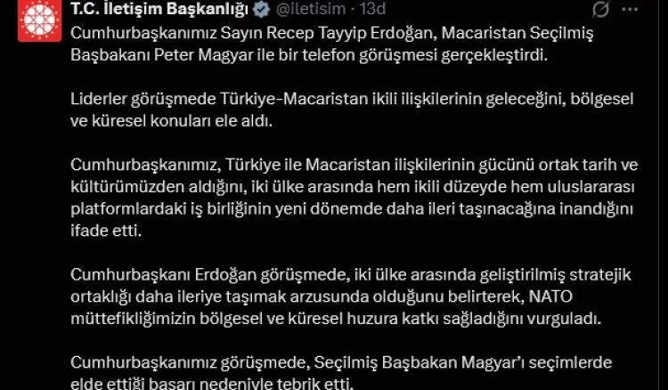 Cumhurbaşkanı Recep Tayyip Erdoğan, Macaristan seçilmiş Başbakanı Peter Magyar ile bir telefon görüşmesi gerçekleştirdi.