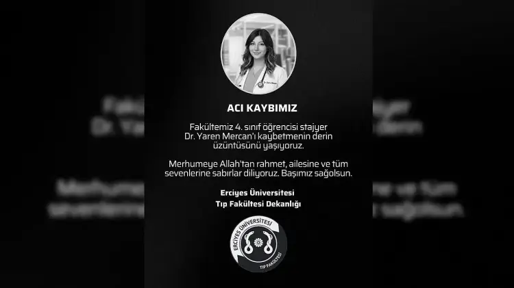 Erciyes Üniversitesi (ERÜ), Tıp Fakültesi 4. sınıf öğrencisi stajyer doktor Yaren Mercan’ın hayatını kaybettiğini duyurdu. Üniversitenin sosyal medya hesabından yapılan açıklamada, genç öğrencinin kaybının derin bir üzüntü yarattığı ifade edildi.