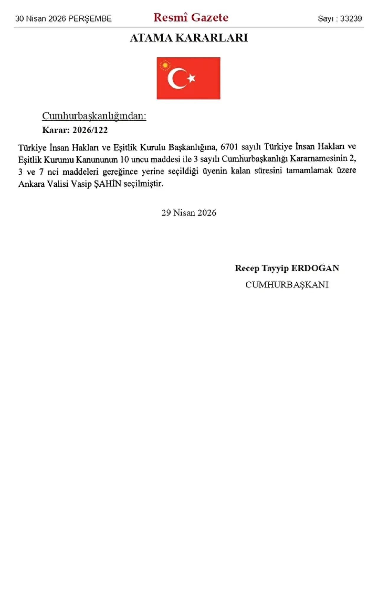 Atama kararları kapsamında Türkiye İnsan Hakları ve Eşitlik Kurulu Başkanlığına, Ankara Valisi Vasip Şahin seçildi. Ayrıca Milli Güvenlik Kurulu Genel Sekreterliği bünyesinde açık bulunan Genel Sekreter Yardımcılıklarına Füsun Arslantosun ve Alper Görkem Aksu atandı. İçişleri Bakanlığı Personel Genel Müdürlüğü ile Nüfus ve Vatandaşlık İşleri Genel Müdürlüğü kadrolarında da üst düzey yardımcı atamaları yapılarak bürokraside yeni bir dönemin kapıları aralandı.