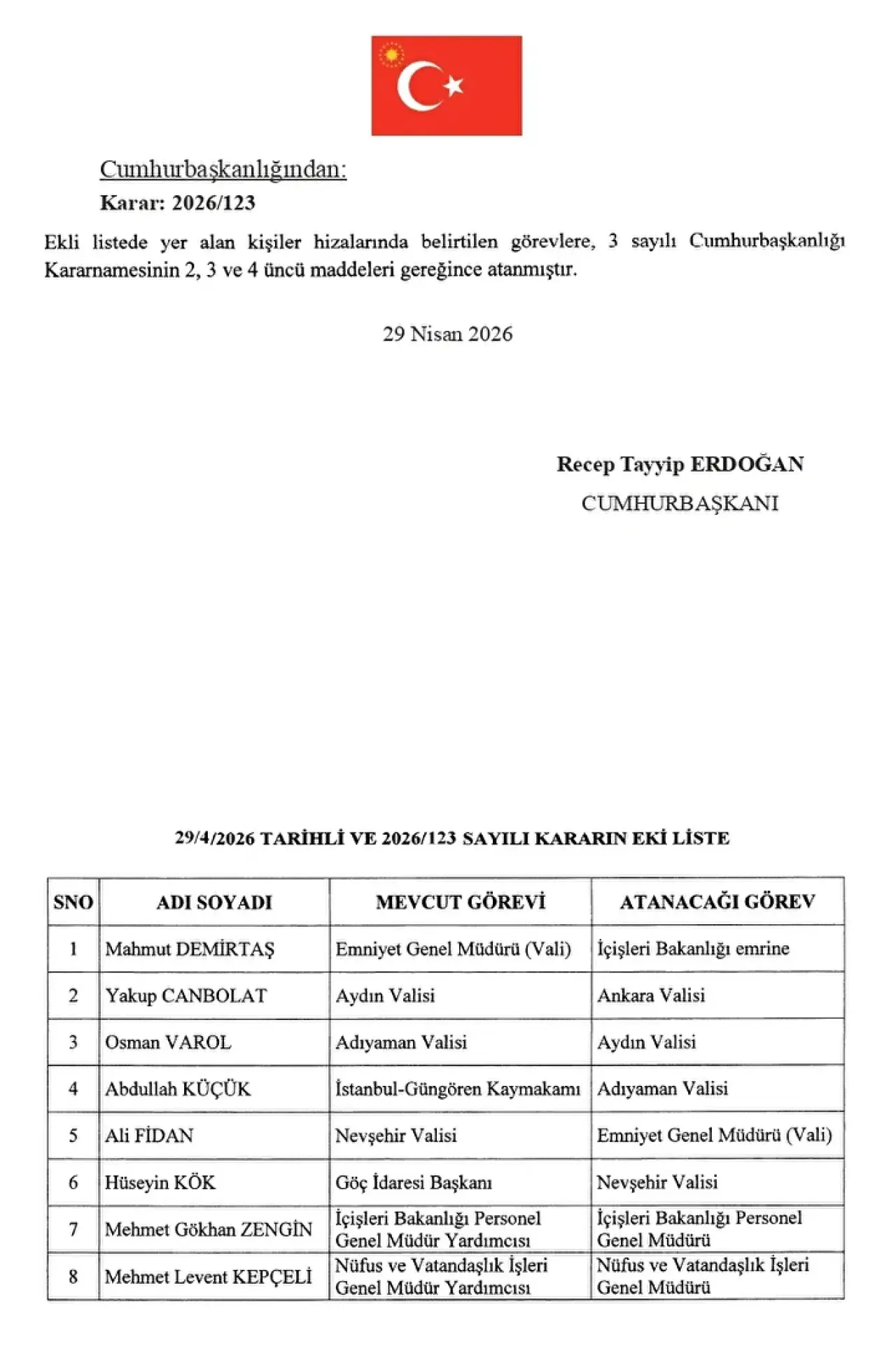 Resmi Gazete’de yayımlanan 2026/123 sayılı karar ile Emniyet Genel Müdürlüğü görevine Nevşehir Valisi Ali Fidan atandı. 1970 Bolu Gerede doğumlu olan Fidan, mülki idare amirliği mesleğindeki tecrübesiyle biliniyor. İstanbul Üniversitesi Siyasal Bilgiler Fakültesi mezunu olan ve akademik geçmişi de bulunan Fidan, İller İdaresi Genel Müdürlüğü, Düzce Valilği ve Milli Savunma Bakanlığı Müsteşarlığı gibi önemli makamlarda görev yaptıktan sonra emniyet teşkilatının başına geçti.