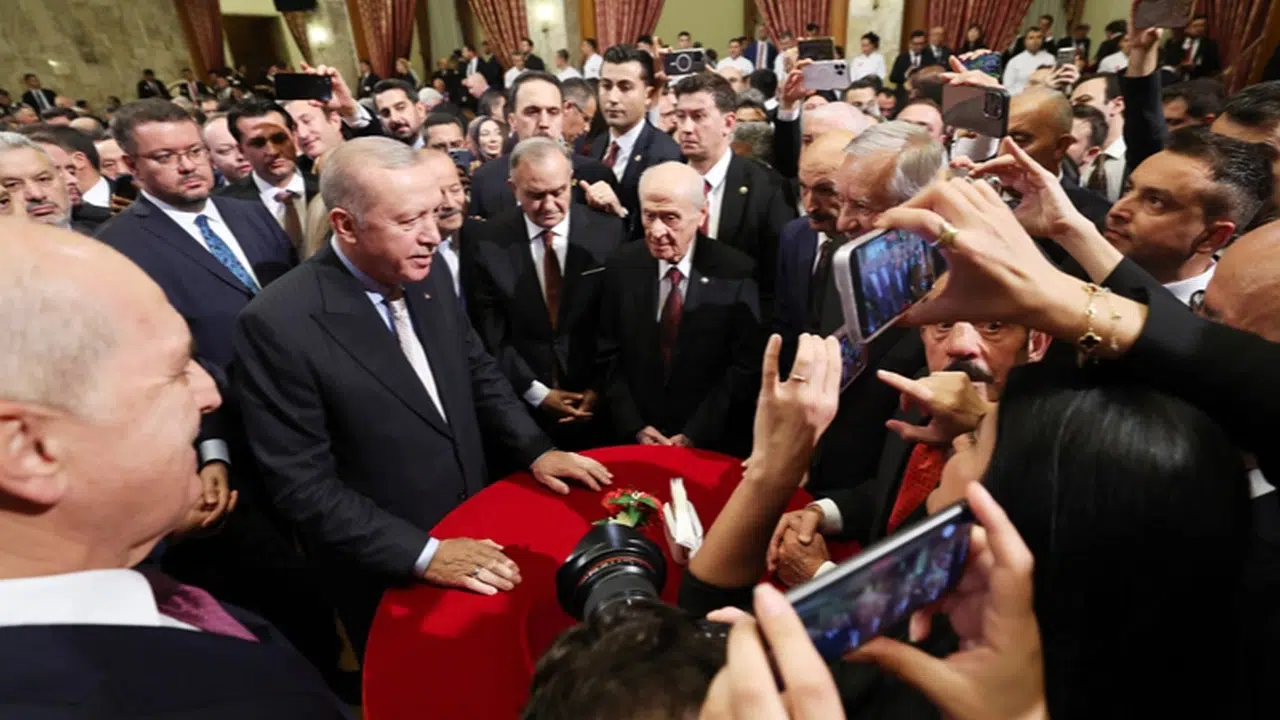 Cumhurbaşkanı Erdoğan, MHP Genel Başkanı Bahçeli'nin ve MHP'li milletvekillerinin bulunduğu, DEM Parti Eş Genel başkanları Bakırhan ve Hatimoğulları ile DEM Parti'li milletvekillerinin olduğu masaları ayrı ayrı ziyaret etti.