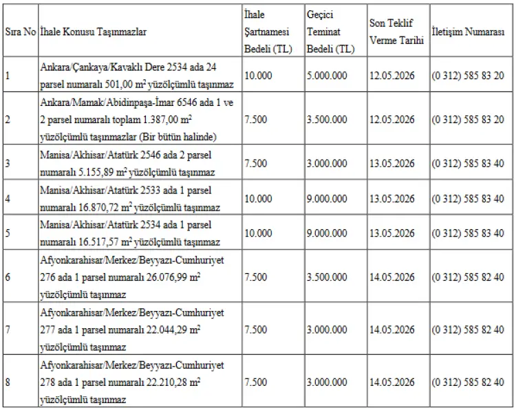 Bugünkü Resmi Gazete'de yayımlanan ilana göre özelleştirme kapsamındaki taşınmazlar, farklı şehirlerde yer alıyor. Bunlar arasında Ankara, Manisa ve Afyonkarahisar illerinde bulunan çeşitli büyüklüklerdeki arsalar yer almakta. İhalelere katılacak yatırımcılar, her taşınmaz için ayrı ayrı teklif sunacak ve her bir taşınmaz için İhale Şartnamesi almak zorunda olacaklar.
