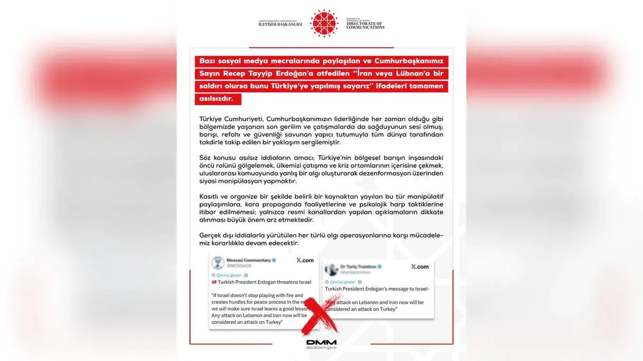 Türkiye Cumhuriyeti İletişim Başkanlığı, son günlerde sosyal medya platformlarında dolaşıma sokulan ve Cumhurbaşkanı Recep Tayyip Erdoğan’a atfedilen bazı ifadelerle ilgili kamuoyunu bilgilendiren bir açıklama yaptı. Yapılan açıklamada, özellikle “İran veya Lübnan’a bir saldırı olursa bunu Türkiye’ye yapılmış sayarız” şeklindeki sözlerin tamamen asılsız olduğu vurgulandı.