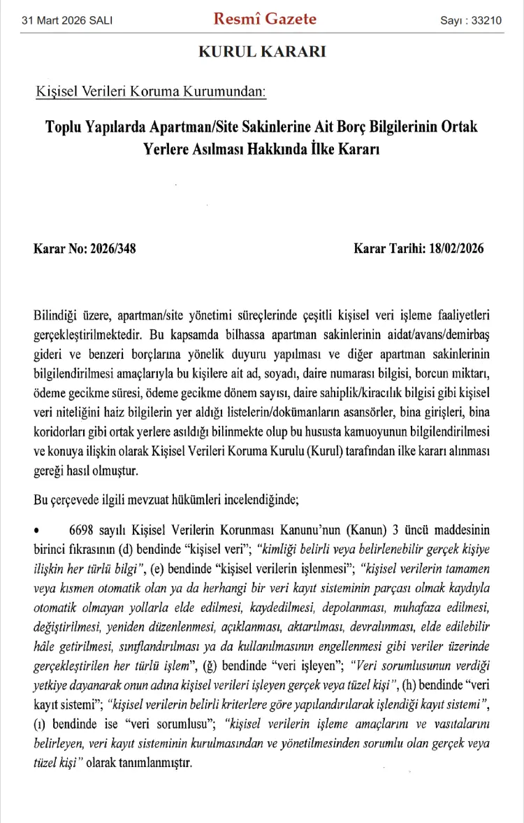 31 Mart 2026 tarihli Resmî Gazete'de yayımlanan KVKK'nın 2026/348 sayılı kararı ile ilgili düzenleme, kişisel verilerin korunmasına ilişkin uygulamalarda önemli bir netlik sağladı. Karar, özellikle site yönetimleri, apartman yöneticileri ve benzeri idari yapıların sıklıkla başvurduğu 'ifşa yoluyla tahsilat' yöntemini açık biçimde hukuka aykırı kapsamına aldı.