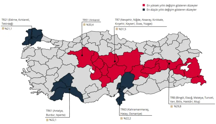 Bölgesel dağılımda en yüksek yıllık artış yüzde 31,5 ile TR71 (Nevşehir, Niğde, Aksaray, Kırıkkale, Kırşehir, Kayseri, Sivas, Yozgat) bölgesinde gerçekleşti.