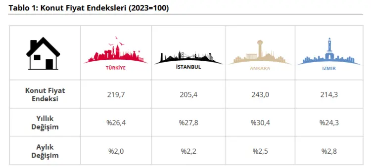 Mart ayında İstanbul'da aylık yüzde 2,2, Ankara'da yüzde 2,5 ve İzmir'de yüzde 2,8 oranında artış kaydedildi. Yıllık bazda ise İstanbul'da yüzde 27,8, Ankara'da yüzde 30,4 ve İzmir'de yüzde 24,3'lük yükseliş görüldü.