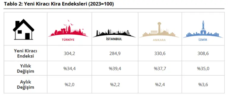 Büyükşehirlerde kira artışları İstanbul'da yüzde 39,4, Ankara'da yüzde 37,7 ve İzmir'de yüzde 35 seviyesinde gerçekleşti. Bölgesel olarak en yüksek kira artışı yüzde 40,5 ile Doğu Anadolu'daki TRB2 (Erzurum, Erzincan, Bayburt, Ağrı, Ardahan, Kars, Iğdır) bölgesinde görülürken, en düşük artış yüzde 25,7 ile TR63 (Hatay, Kahramanmaraş, Osmaniye) bölgesinde kaydedildi.