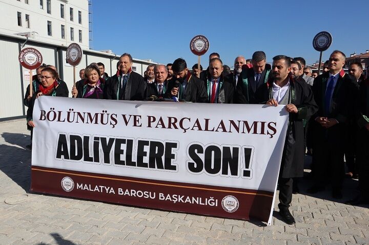 Malatya adliye binası önünde eylem. Deprem sonrası adliyenin 7 ayrı noktada hizmet vermesi, avukatların tepkisine neden oldu. 6 Şubat günü yaşanan Kahramanmaraş merkezli depremlerde ağır hasar alan illerden biri olan Malatya’da adliye binası da ağır hasar alınca farklı kurum ve kuruluşlara ait 7 binada adli hizmet verilmeye başlandı. Bu duruma tepki gösteren Malatya Barosu bugün düzenlediği yürüyüş ile çözüm talep etti.