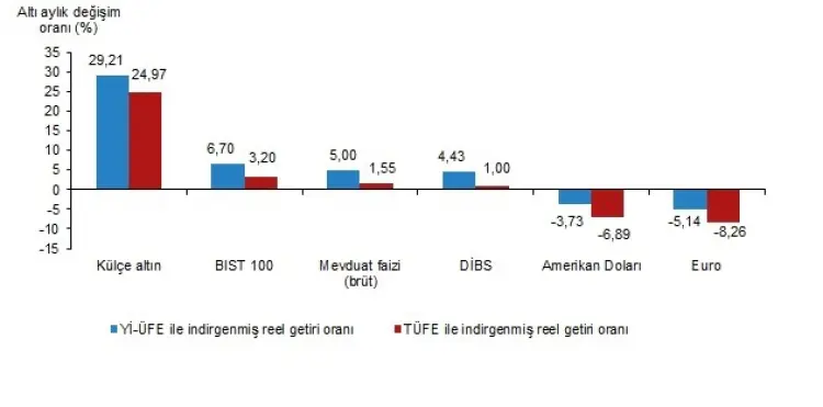 Altı aylık verilerde de lider değişmedi. Külçe altın, Yİ-ÜFE ile yüzde 29,21, TÜFE ile yüzde 24,97 oranında reel getiri sağlayarak zirvede yer aldı. Euro ise bu dönemde de yatırımcısına en çok kaybettiren araç oldu.