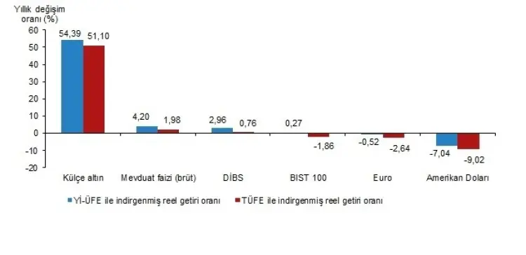 Yıllık bazda bakıldığında ise külçe altın açık ara öne çıktı. Altın, Yİ-ÜFE ile yüzde 54,39, TÜFE ile yüzde 51,10 oranlarında yatırımcısına en yüksek reel kazancı sağladı. Aynı dönemde Yİ-ÜFE'ye göre mevduat faizi yüzde 4,20, DİBS yüzde 2,96 ve BIST 100 yüzde 0,27 oranında reel getiri sunarken; euro ve Amerikan doları yatırımcısına kaybettirdi. TÜFE'ye göre ise mevduat faizi ve DİBS sınırlı getiri sağlarken, BIST 100, euro ve dolar negatif performans gösterdi.