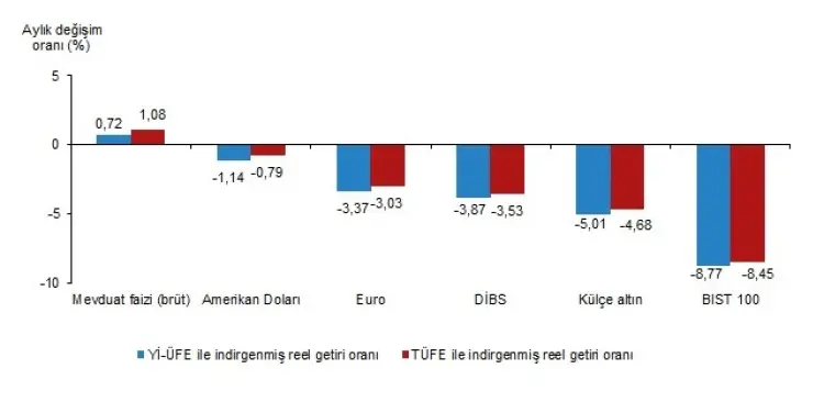 TÜİK, Mart ayına ilişkin 'Finansal Yatırım Araçlarının Reel Getiri Oranları' verilerini yayımladı. Buna göre, aylık bazda en yüksek reel getiri, yurt içi üretici fiyat endeksi (Yİ-ÜFE) ile hesaplandığında yüzde 0,72, tüketici fiyat endeksi (TÜFE) ile hesaplandığında ise yüzde 1,08 ile mevduat faizinde (brüt) gerçekleşti.