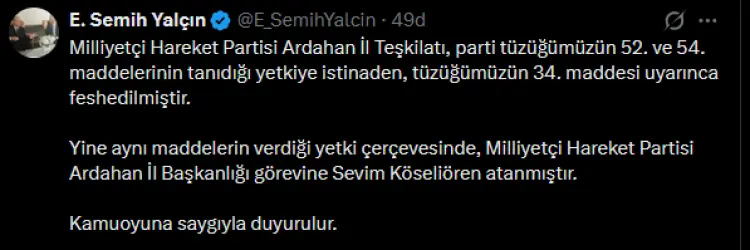 MHP Genel Başkan Yardımcısı E. Semih Yalçın, MHP Ardahan İl Teşkilatı'na ilişkin yeni bir karar alındığını duyurdu.