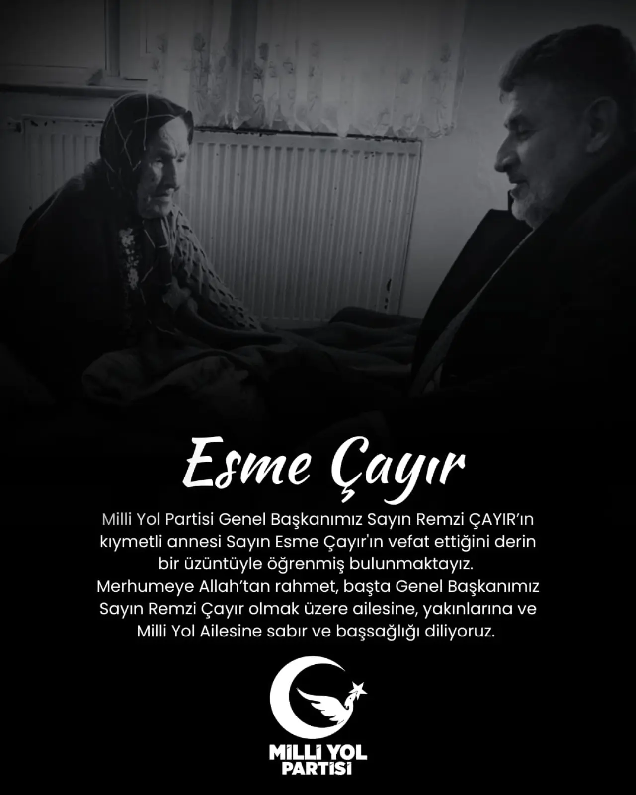 Milli Yol Partisi Genel Başkanı Remzi Çayır’ın annesinin vefat ettiği öğrenildi. Siyasi çevrelerden ve partililerden gelen başsağlığı mesajları kısa sürede art arda yayımlandı.