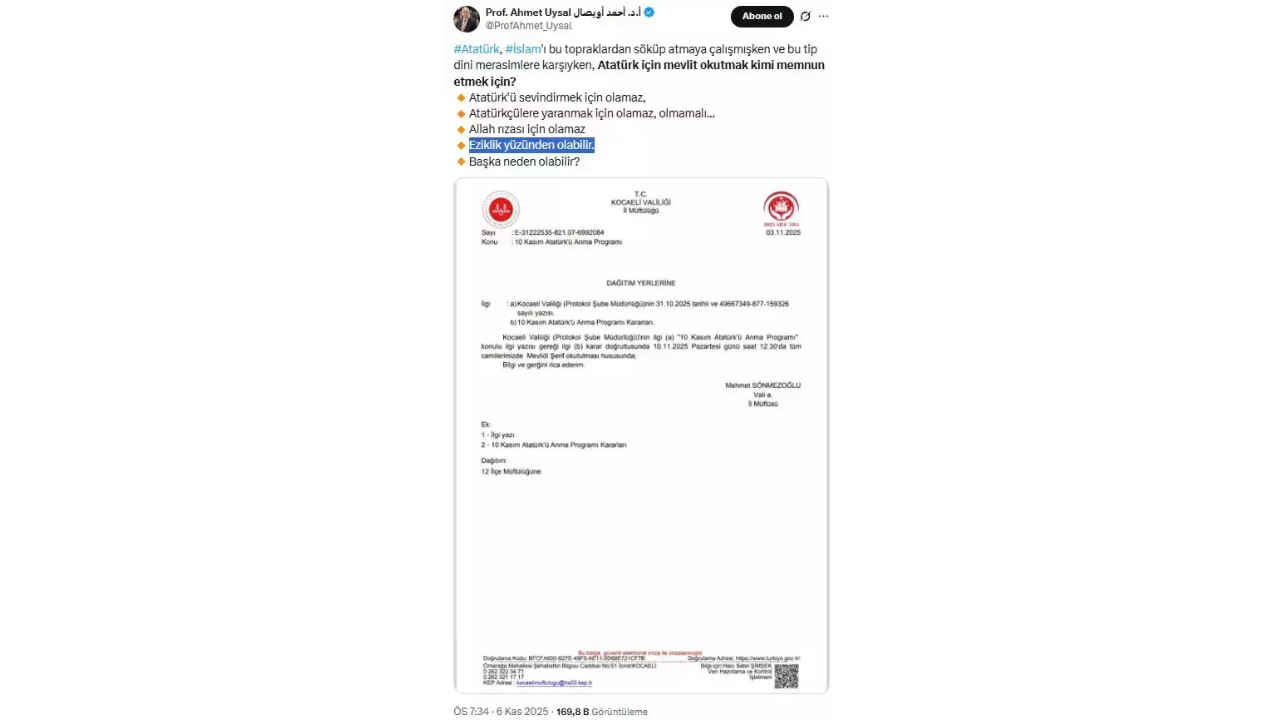 İstanbul Üniversitesi Siyasal Bilgiler Fakültesi Öğretim Üyesi Prof. Dr. Ahmet Uysal, Kocaeli Müftülüğü'nün 10 Kasım Atatürk'ü anma etkinlikleri kapsamında il genelindeki camilerde mevlit okunacağı yönündeki kararını sosyal medyadan sert bir dille eleştirdi. Uysal'ın, "Atatürk'ün İslam'ı bu topraklardan söküp atmaya çalıştığını" iddia ettiği paylaşımı kısa sürede büyük tepki topladı. Yoğun eleştirilerin ardından akademisyen, tartışma yaratan paylaşımını sosyal medya hesabından kaldırdı.
