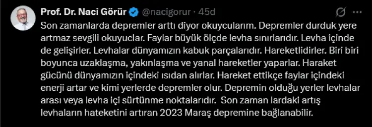 Son dönemde gözlenen sismik artışın 2023 Kahramanmaraş depremlerinin bölgesel etkileriyle bağlantılı olabileceğini de dile getirdi.