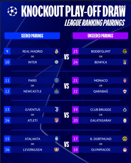 Lig aşamasını 20. sırada tamamlayan Galatasaray’ın play-off turundaki muhtemel rakipleri de netleşti. Kura formatına göre sarı-kırmızılı ekip, lig etabını 13. sırada bitiren Juventus ya da 14. sırada tamamlayan Atlético Madrid ile eşleşecek.