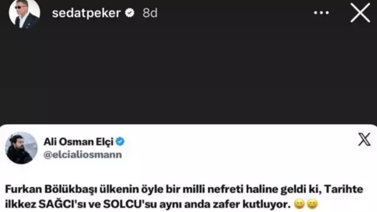 Olayın ardından Instagram hesabı üzerinden açıklama yapan Sedat Peker, Furkan Bölükbaşı aleyhine hazırlanmış bir metni paylaştı. Peker'in profilinde yer verdiği paylaşımda, "Furkan Bölükbaşı öyle bir milli nefret haline geldi ki, tarihte ilk kez sağcısı ve solcusu aynı anda zafer kutluyor" ifadeleri kullanıldı. Bu hamle ile Peker'in söz konusu tutuklama hakkındaki tavrını netleştirdiği gözlendi.