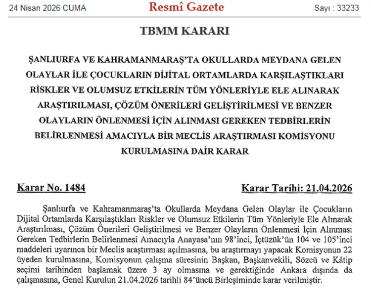 Türkiye Büyük Millet Meclisi (TBMM), Şanlıurfa ve Kahramanmaraş'ta okullarda meydana gelen olayların yanı sıra çocukların dijital ortamlarda maruz kaldığı risk ve olumsuz etkilerin kapsamlı şekilde araştırılması için harekete geçti.