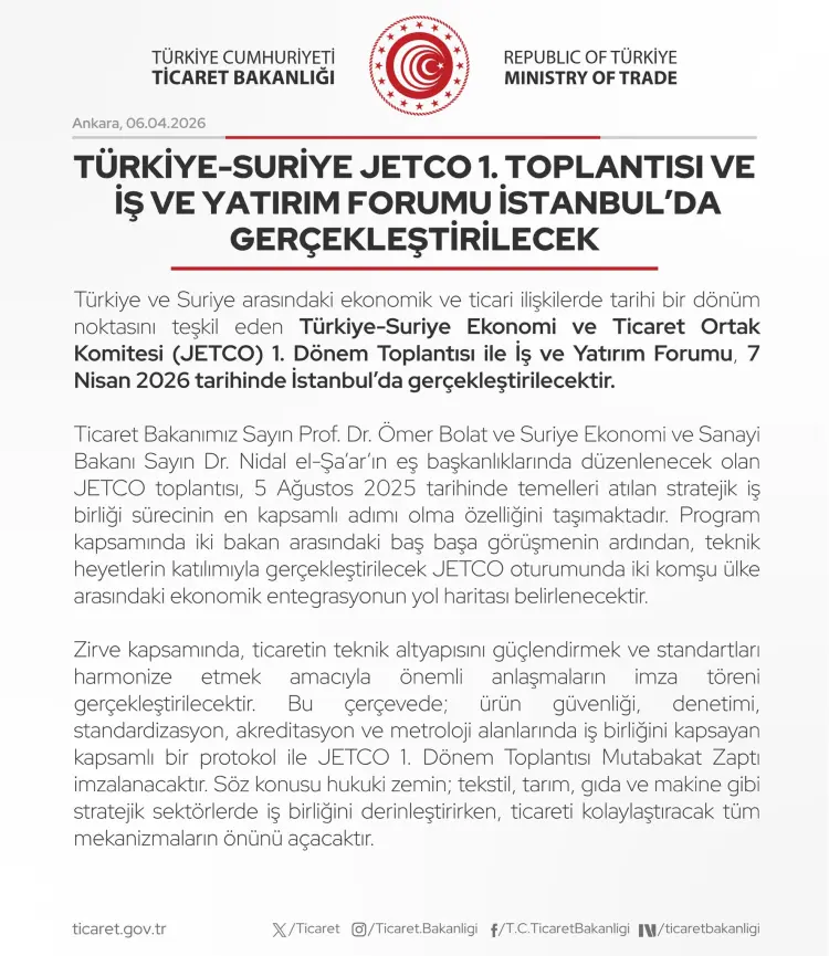 Türkiye ve Suriye arasındaki ekonomik ve ticari ilişkilerde tarihi bir dönüm noktası olarak nitelendirilen Türkiye-Suriye Ekonomi ve Ticaret Ortak Komitesi (JETCO) 1. Dönem Toplantısı ile İş ve Yatırım Forumu, 7 Nisan 2026'da İstanbul'da gerçekleştirilecek. Toplantıya Prof. Dr. Ömer Bolat ve Dr. Nidal el-Şa'ar eş başkanlık yapacak.