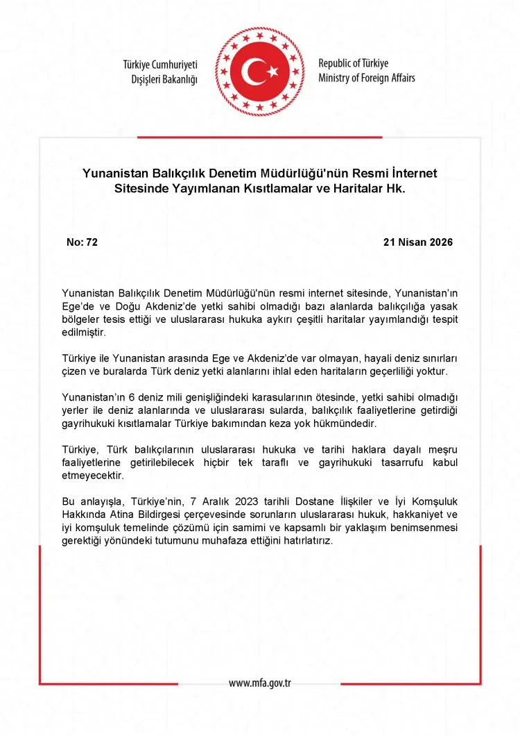 Bakanlıktan yapılan yazılı açıklamada, Yunanistan Balıkçılık Denetim Müdürlüğü'nün resmi internet sitesinde yer alan ve deniz yetki alanı dışında kalan bölgeleri de kapsayan haritaların uluslararası hukuka aykırı olduğu belirtildi. Açıklamada, Ege ve Doğu Akdeniz'de Türkiye ile Yunanistan arasında var olmayan deniz sınırlarının çizildiği ve Türk deniz yetki alanlarının ihlal edildiği ifade edilerek, bu tür girişimlerin 'geçersiz ve yok hükmünde' olduğu vurgulandı.