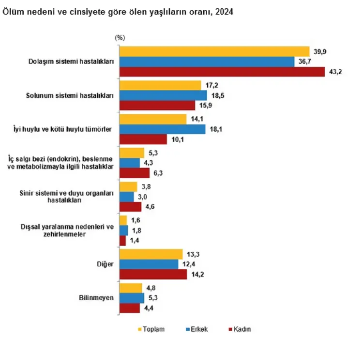 Ölüm nedenleri açısından veriler incelendiğinde yaşlıların yüzde 39,9'u dolaşım sistemi hastalıklarından hayatını kaybederken, yüzde 17,2'si solunum sistemi hastalıkları ve yüzde 14,1'i tümörler nedeniyle yaşamını yitirdiği gözlendi.