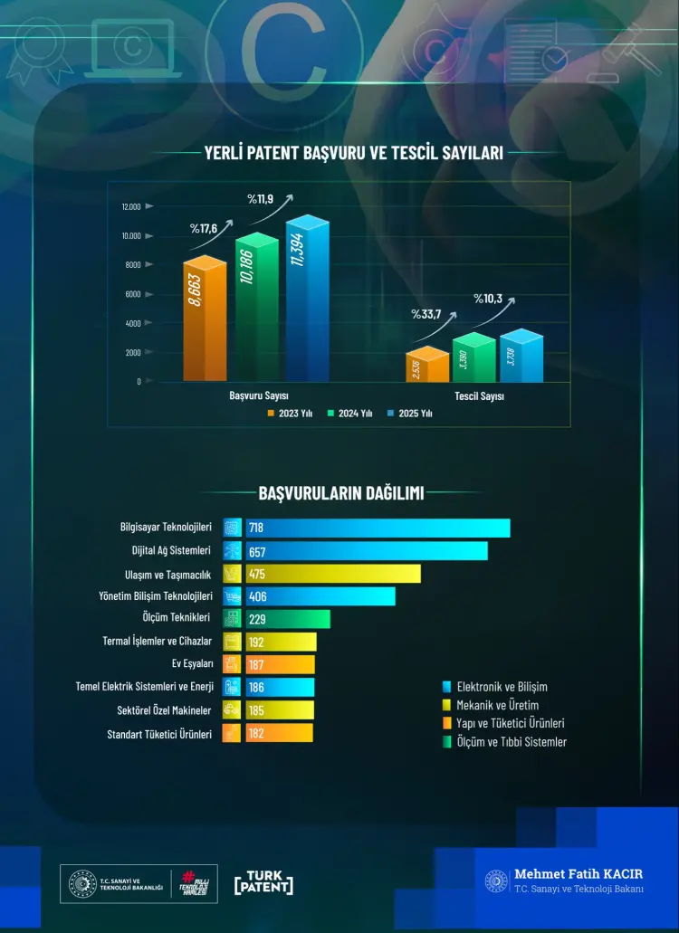 Sanayi ve Teknoloji Bakanı Mehmet Fatih Kacır, 2025 yılına ilişkin patent ve faydalı model verilerini paylaşarak Türkiye'nin fikrî mülkiyet alanındaki yükselişine dikkat çekti.