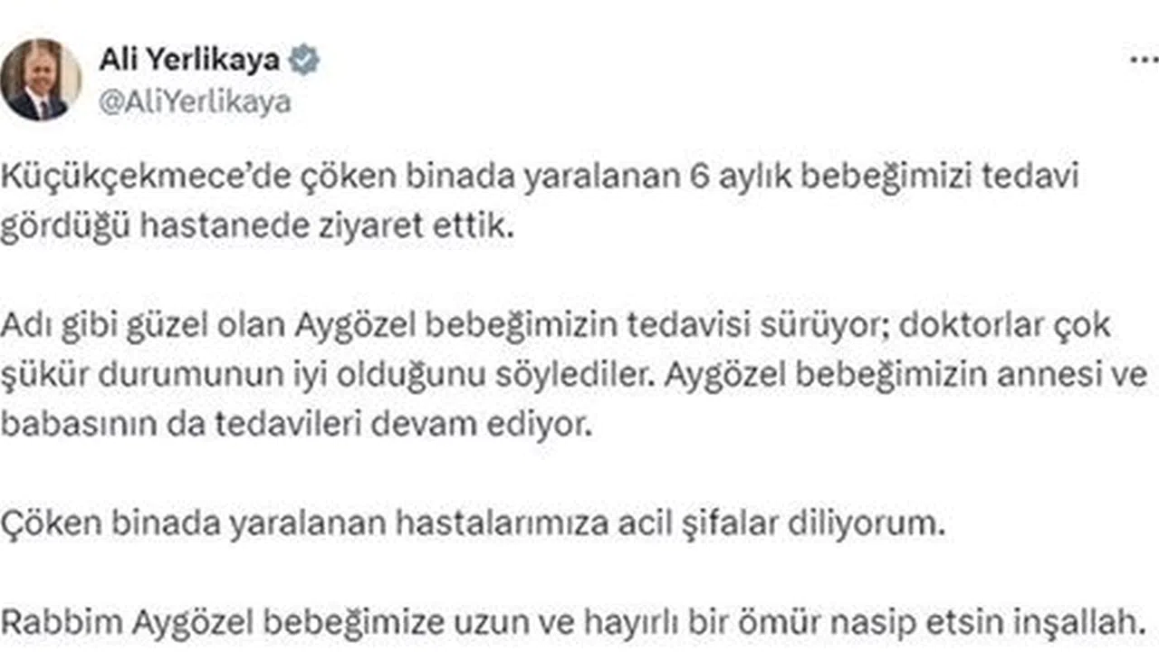 Küçükçekmece'de meydana gelen binanın çökmesi sonucunda yaralanan ve hastanede tedavi gören 6 aylık bebeği İçişleri Bakanı Ali Yerlikaya ziyaret etti. Bakan Yerlikaya, bebeğin tedavi gördüğü hastaneye giderek durumu hakkında doktorlardan bilgi aldı. Ziyaretin ardından Bakan Yerlikaya, sosyal medya hesabından bebeğin fotoğrafını paylaşarak, "Küçükçekmece'de çöken binada yaralanan 6 aylık bebeğimizi tedavi gördüğü hastanede ziyaret ettik. Adı gibi güzel olan Aygözel bebeğimizin tedavisi sürüyor; doktorlar çok şükür durumunun iyi olduğunu söylediler. Aygözel bebeğimizin annesi ve babasının da tedavileri devam ediyor. Çöken binada yaralanan hastalarımıza acil şifalar diliyorum. Rabbim Aygözel bebeğimize uzun ve hayırlı bir ömür nasip etsin inşallah" ifadelerini kullandı.
