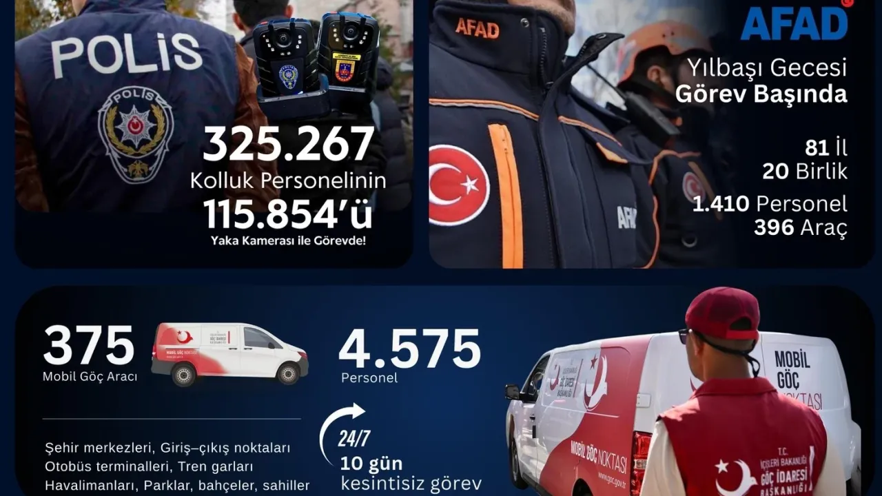 İçişleri Bakanı Ali Yerlikaya, yılbaşı sürecine ilişkin alınan güvenlik tedbirlerini kamuoyuyla paylaştı. Bakanlığa bağlı Emniyet, Jandarma, Sahil Güvenlik, Göç İdaresi ve AFAD birimleri, 30 Aralık - 2 Ocak tarihleri arasında kesintisiz görev yapacak.