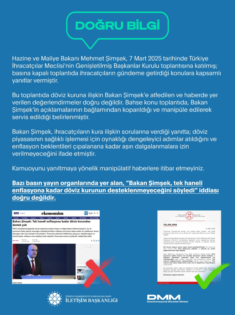 Dezenformasyonla Mücadele Merkezi'nden yapılan yazılı açıklamada, "Hazine ve Maliye Bakanı Mehmet Şimşek, 7 Mart 2025 tarihinde Türkiye İhracatçılar Meclisi'nin Genişletilmiş Başkanlar Kurulu toplantısına katılmış; basına kapalı toplantıda ihracatçıların gündeme getirdiği konulara kapsamlı yanıtlar vermiştir. Bu toplantıda döviz kuruna ilişkin Bakan Şimşek’e atfedilen ve haberde yer verilen değerlendirmeler doğru değildir. Bahse konu toplantıda, Bakan Şimşek’in açıklamalarının bağlamından koparıldığı ve manipüle edilerek servis edildiği belirlenmiştir. Bakan Şimşek, ihracatçıların kura ilişkin sorularına verdiği yanıtta; döviz piyasasının sağlıklı işlemesi için oynaklığı dengeleyici adımlar atıldığını ve enflasyon beklentileri çıpalanana kadar aşırı dalgalanmalara izin verilmeyeceğini ifade etmiştir. Kamuoyunu yanıltmaya yönelik manipülatif haberlere itibar etmeyiniz" ifadeleri yer aldı.