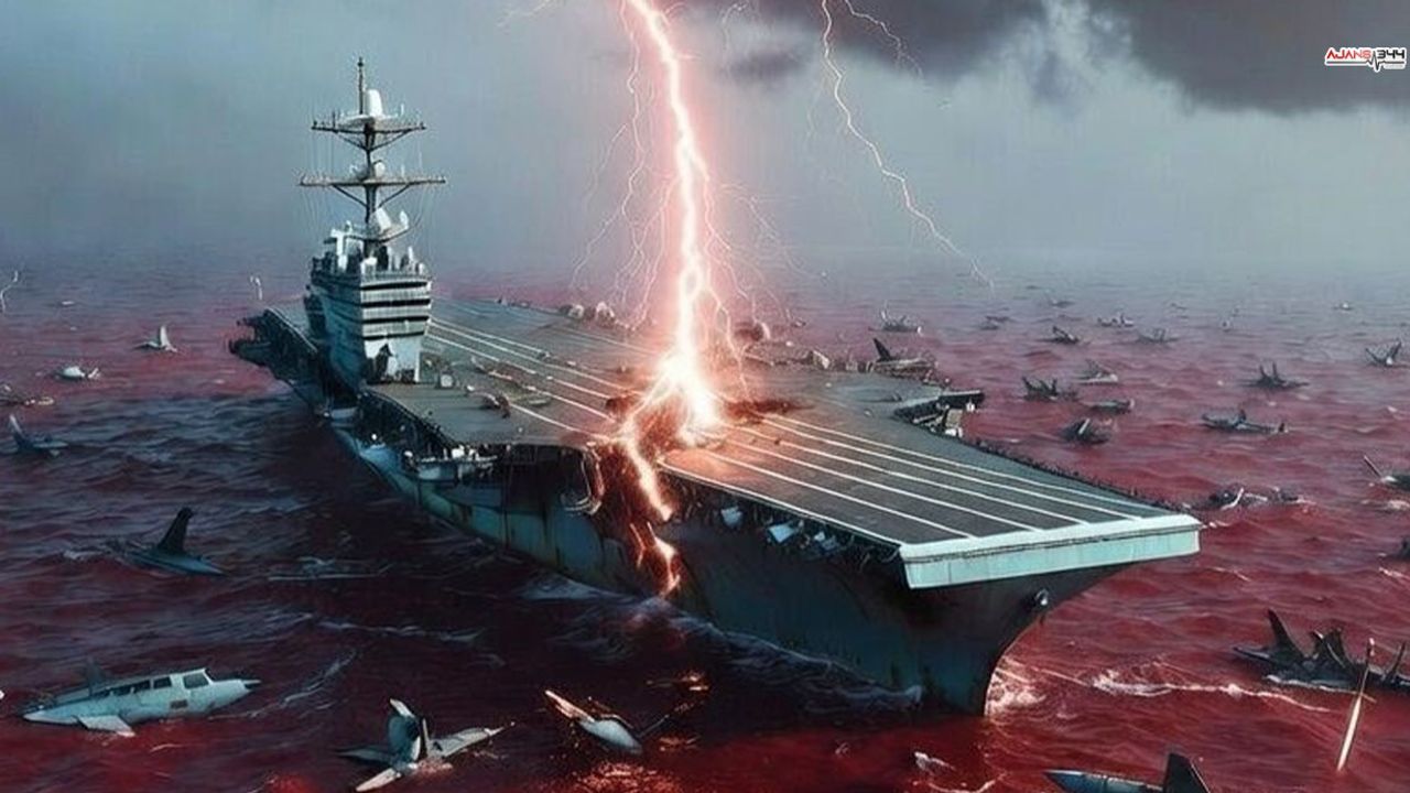 Paylaşılan görselde, fırtınalı bir deniz ve koyu kırmızı tonların hâkim olduğu dramatik bir atmosfer dikkat çekti. Kompozisyonda, ABD donanmasına ait uçak gemisinin hedef konumunda gösterildiği, gemiye yıldırım isabet ettiği detayının işlendiği görüldü. Bunun yanı sıra ABD’ye ait savaş uçaklarının denize düşmüş ve batmış şekilde tasvir edilmesi ile denize saplanmış kılıç figürleri görselin öne çıkan unsurları arasında yer aldı.