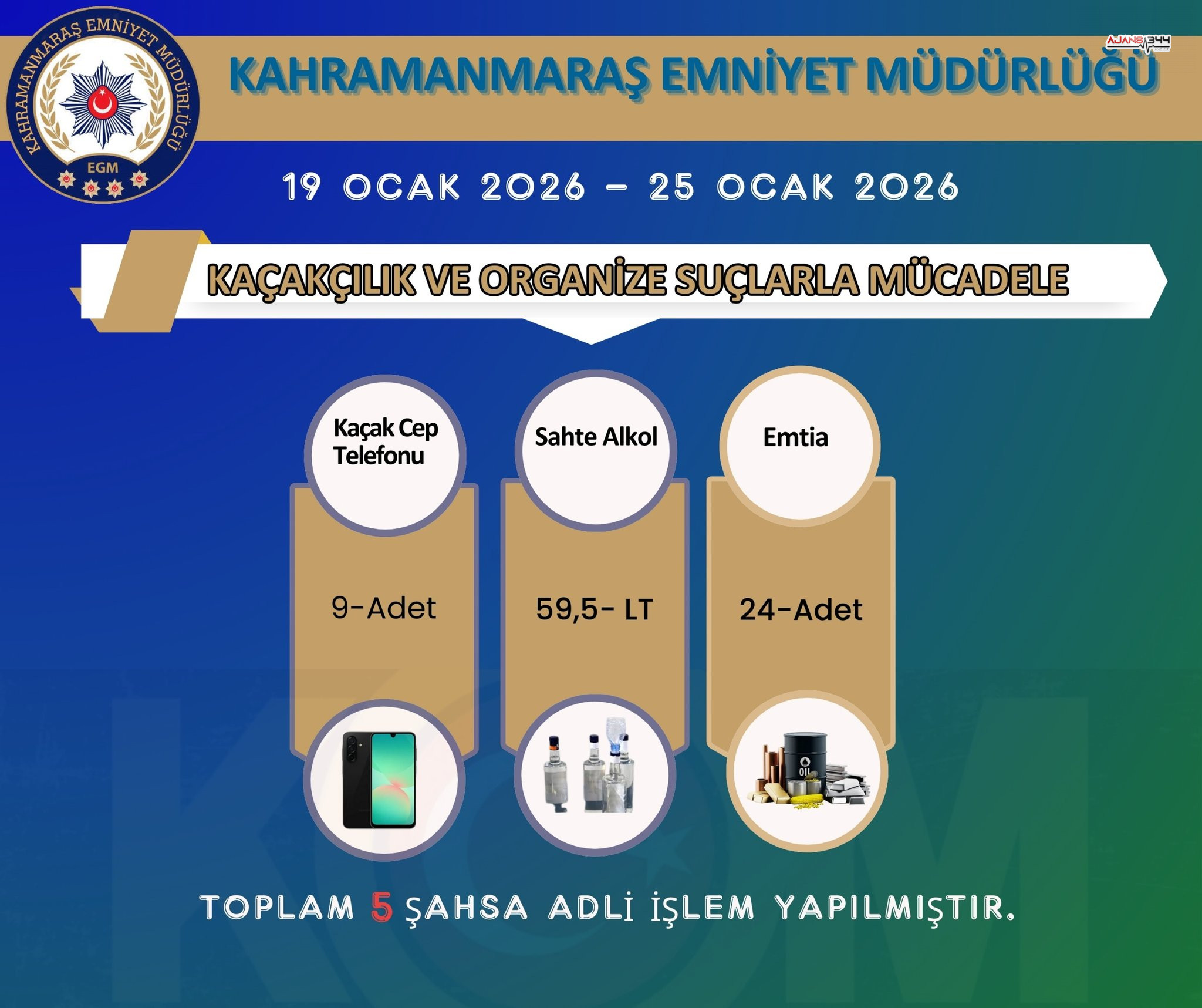 Kahramanmaraş Emniyet Müdürlüğü’nün kaçakçılık ve organize suçlarla mücadele kapsamında yürüttüğü çalışmaların haftalık bilançosu kamuoyuyla paylaşıldı. 19 Ocak 2026 ile 25 Ocak 2026 tarihleri arasında gerçekleştirilen operasyonlarda, kent genelinde dikkat çeken sonuçlar elde edildi.