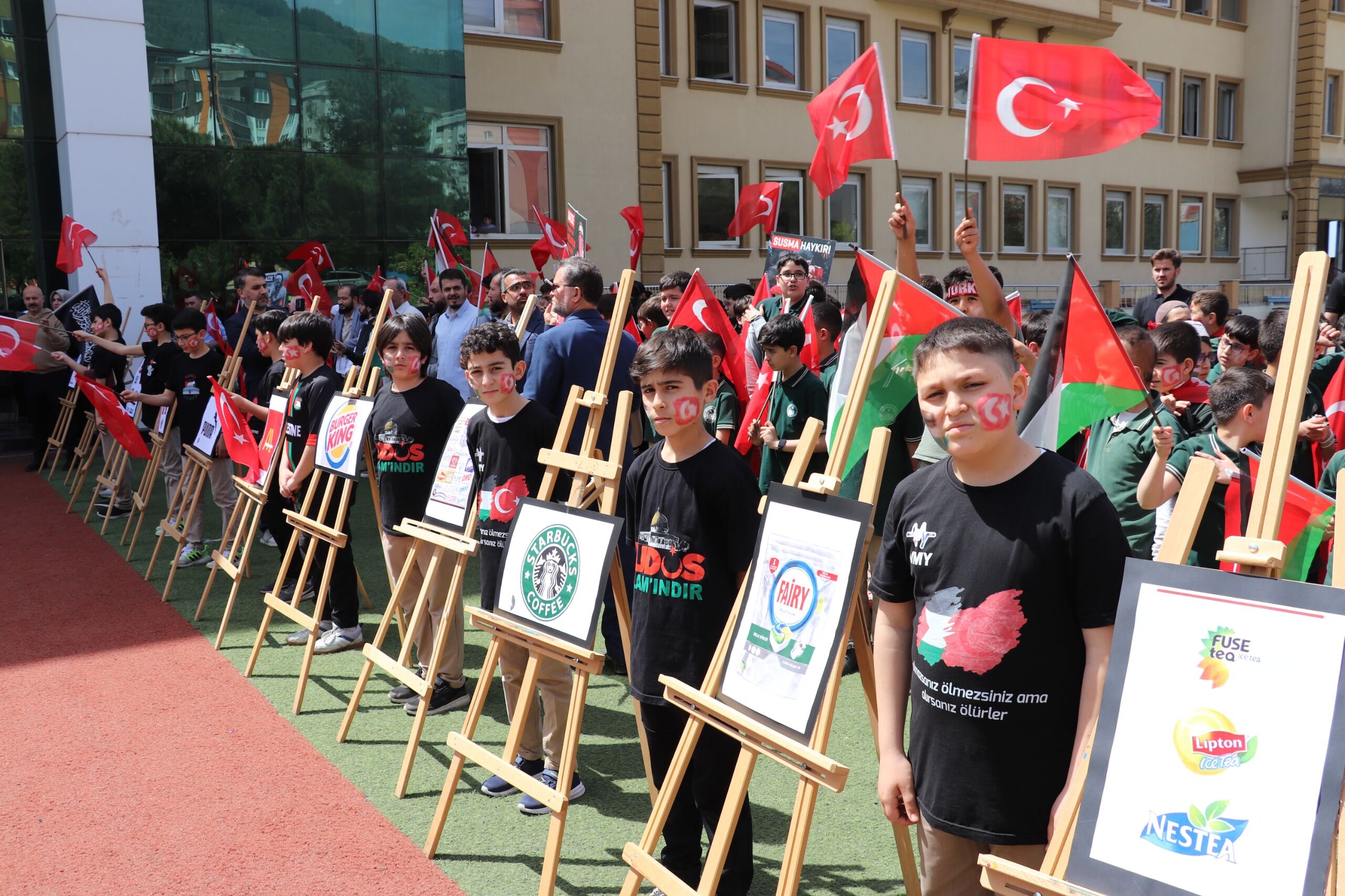 Filistin’e uygulanan ambargoya dikkat çekmek amacıyla öğrenciler tarafından hazırlanan boykot ürünlerine ait el emeği logolar sergilendi. Sloganlarla özgürlük çağrıları yapılırken, etkinlik Kur’an-ı Kerim tilaveti ve Fetih Suresi’nin okunmasıyla manevi bir atmosferde devam etti.