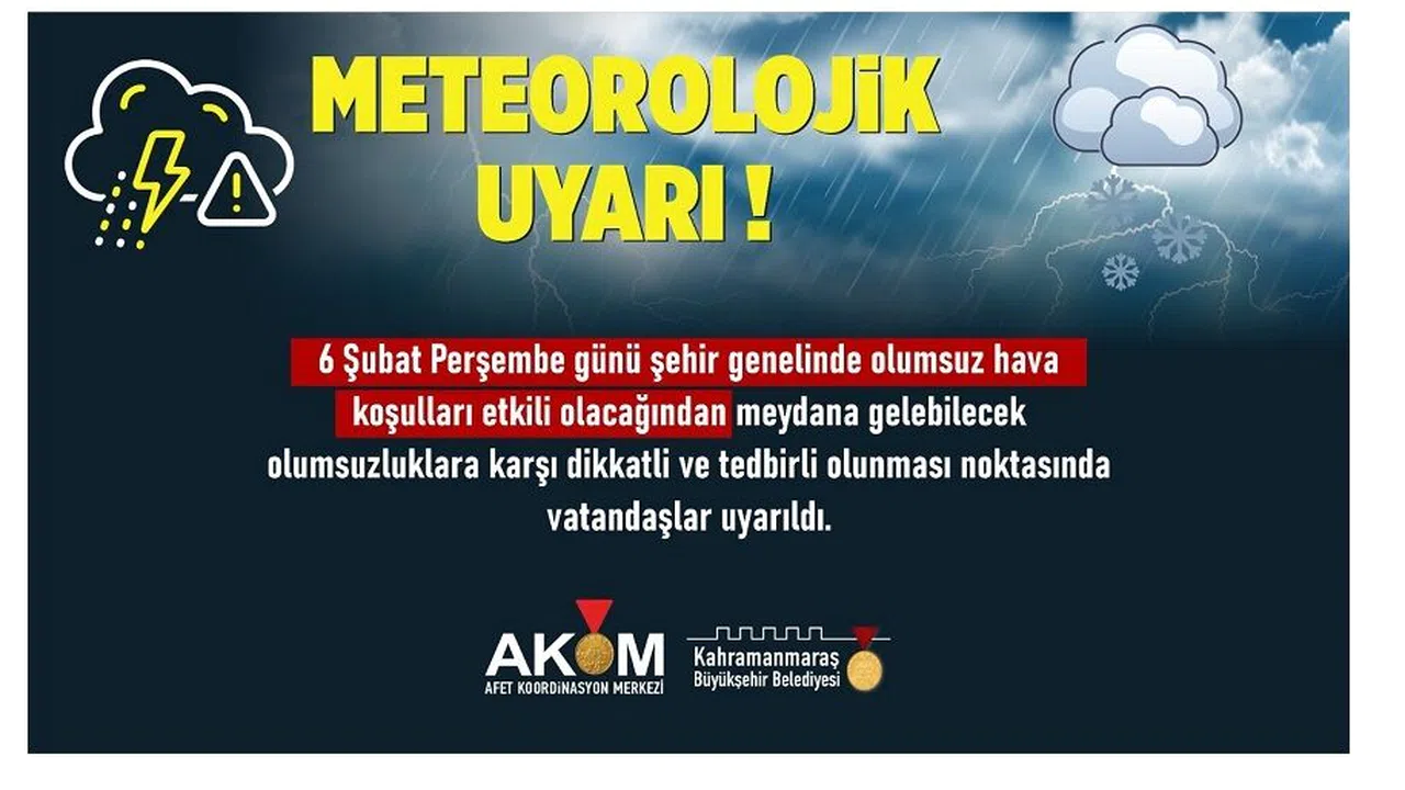 Kahramanmaraş Büyükşehir Belediyesi Afet Koordinasyon Merkezi tarafından yapılan açıklamaya göre, 6 Şubat Perşembe günü şehir genelinde etkili olması beklenen kuvvetli rüzgâr, sağanak yağış, kar yağışı ve fırtına nedeniyle vatandaşların dikkatli ve tedbirli olması gerektiği bildirildi. Meteorolojik veriler doğrultusunda yapılan uyarıya göre, 6 Şubat Perşembe günü saat 00.00 itibarıyla başlayacak olumsuz hava koşullarının 7 Şubat Cuma günü sabah saatlerine kadar devam etmesi öngörülüyor. Bu süreçte şehir genelinde özellikle yüksek kesimlerde yoğun kar yağışı beklenirken, şehir merkezinde sağanak yağışın etkili olacağı tahmin ediliyor. Kuvvetli rüzgâr ve fırtına nedeniyle çatı uçması, ağaç ve direk devrilmesi gibi olumsuzlukların yaşanabileceği belirtiliyor. Büyükşehir Belediyesi tarafından yapılan açıklamada, beklenen olumsuz hava şartlarına karşı tüm önlemlerin alındığı ve ilgili ekiplerin sahada teyakkuz halinde olduğu ifade edildi. Acil durumlara karşı kriz masası oluşturulurken, özellikle trafikte oluşabilecek risklere karşı sürücülerin dikkatli olmaları gerektiği vurgulandı.