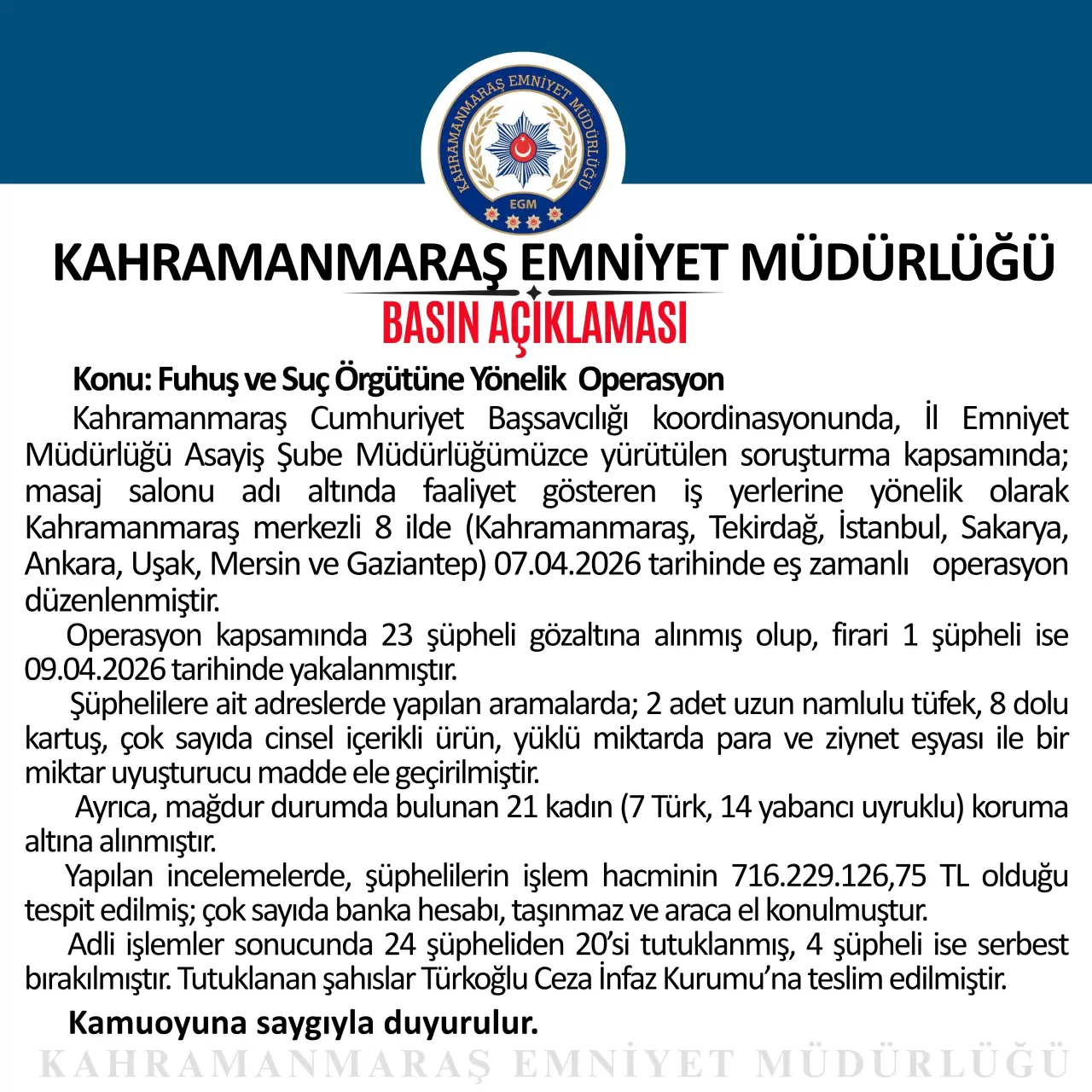 Kahramanmaraş Cumhuriyet Başsavcılığı koordinesinde yürütülen soruşturma kapsamında, İl Emniyet Müdürlüğü Asayiş Şube ekipleri tarafından geniş çaplı bir operasyon düzenlendi. Çalışma kapsamında Kahramanmaraş merkezli olmak üzere Tekirdağ, İstanbul, Sakarya, Ankara, Uşak, Mersin ve Gaziantep’te eş zamanlı uygulama gerçekleştirildi.