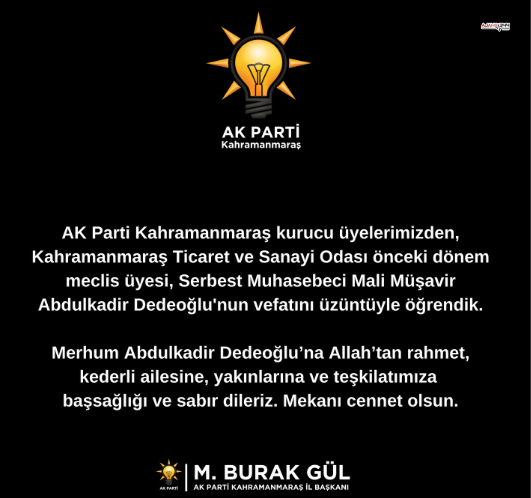 AK Parti Kahramanmaraş İl Başkanı M. Burak Gül imzasıyla paylaşılan taziye mesajında, merhum Abdulkadir Dedeoğlu’na Allah’tan rahmet dilenirken, ailesine, yakınlarına ve teşkilat mensuplarına başsağlığı ve sabır temennisinde bulunuldu. Mesajda, “Mekânı cennet olsun” ifadeleriyle duyulan üzüntü dile getirildi.