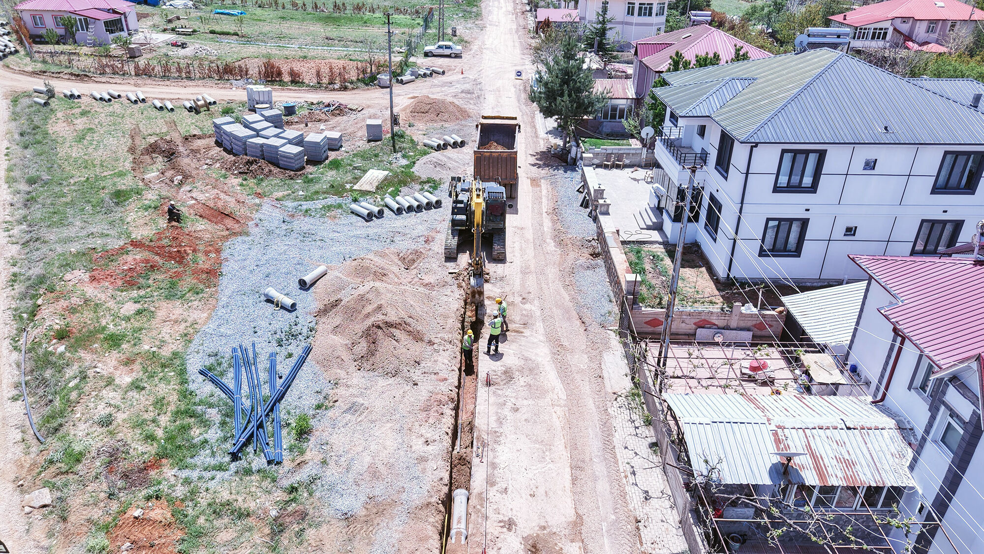 6 Şubat depremlerin ardından şehir genelinde başlatılan altyapı seferberliği tüm hızıyla sürüyor. Şehir genelinde yaklaşık 15 Milyar TL’lik bir bütçeyle yürütülen çalışmalar, kentin altyapı sistemlerini yeniden inşa etmeyi ve afetlere karşı daha dirençli hale getirmeyi hedefliyor. Bu kapsamda KASKİ Genel Müdürlüğü koordinesinde yürütülen projelerden biri de Afşin Hilalkent Kümeevler’de hayata geçiriliyor. Bölgenin altyapı sorunlarını kalıcı olarak çözmeyi amaçlayan projede, yaklaşık 9 Milyon TL’lik yatırımla 4,5 kilometre uzunluğunda yeni bir kanalizasyon hattı inşa ediliyor. Yoğun bir tempoyla sürdürülen çalışmaların %80’i tamamlandı. Saha ekiplerinin gece gündüz demeden çalıştığı projede, modern altyapı standartlarına uygun bir sistemin kurulması hedefleniyor. Yeni kanalizasyon hattı sayesinde hem bölgedeki çevresel risklerin önüne geçilecek hem de yaşam kalitesinde önemli bir artış sağlanacak.