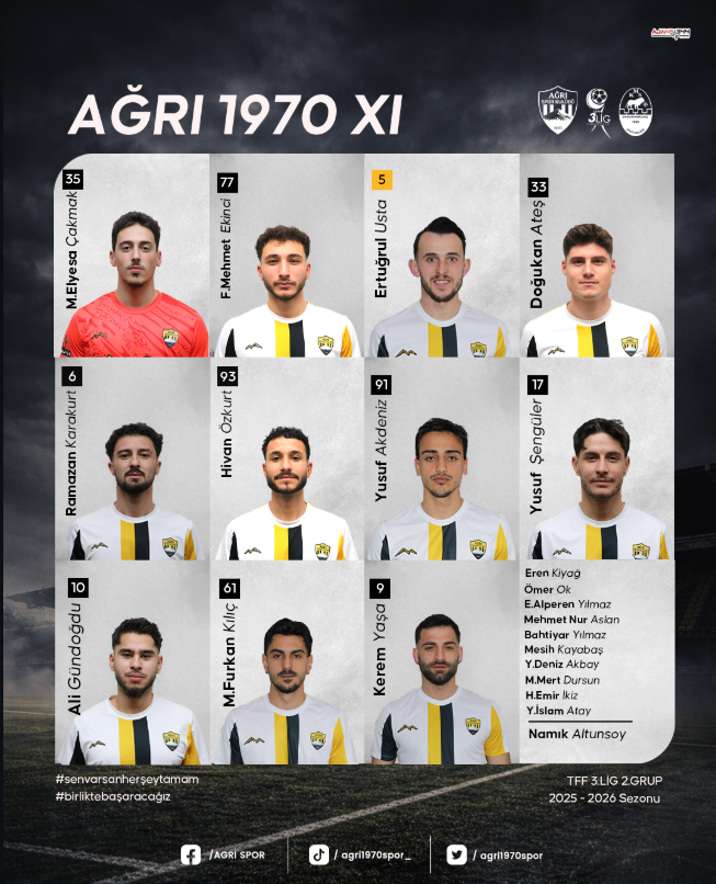 Ağrı 1970 Spor’un ilk 11’inde kalede M. Elyesa Çakmak yer aldı. Savunma hattında Mehmet Ekinci, Ertuğrul Usta ve Doğukan Ateş görev aldı. Orta alanda Ramazan Karakurt, Hiyvan Öztürk, Yusuf Akdeniz ve Yusuf Şengüler forma giydi. Hücum hattında ise Ali Gündoğdu, M. Furkan Kılıç ve Kerem Yaşa ilk düdükle birlikte sahada yer aldı.