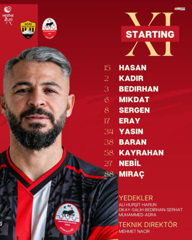 Kahramanmaraşspor’da teknik heyet, sahaya Hasan, Kadir, Bedirhan ve Mikdat’tan oluşan savunma hattıyla çıkma kararı aldı. Orta alanda Sergen, Eray, Yasin ve Baran görev aldı. Hücum hattında Kayrahan, Nebil ve Miraç ilk 11’de yer buldu.