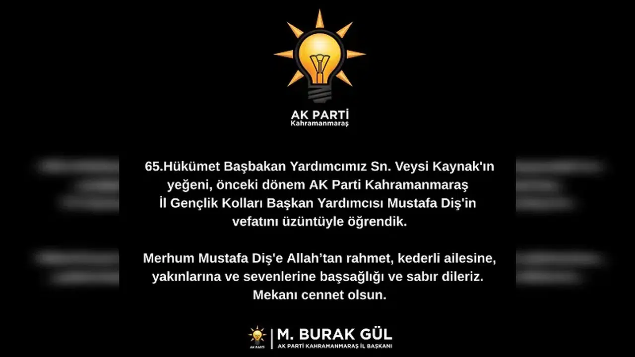 AK Parti Kahramanmaraş İl Başkanı M. Burak Gül tarafından yapılan açıklamada, “Merhum Mustafa Diş’e Allah’tan rahmet, kederli ailesine, yakınlarına ve sevenlerine başsağlığı ve sabır diliyoruz” ifadelerine yer verildi.