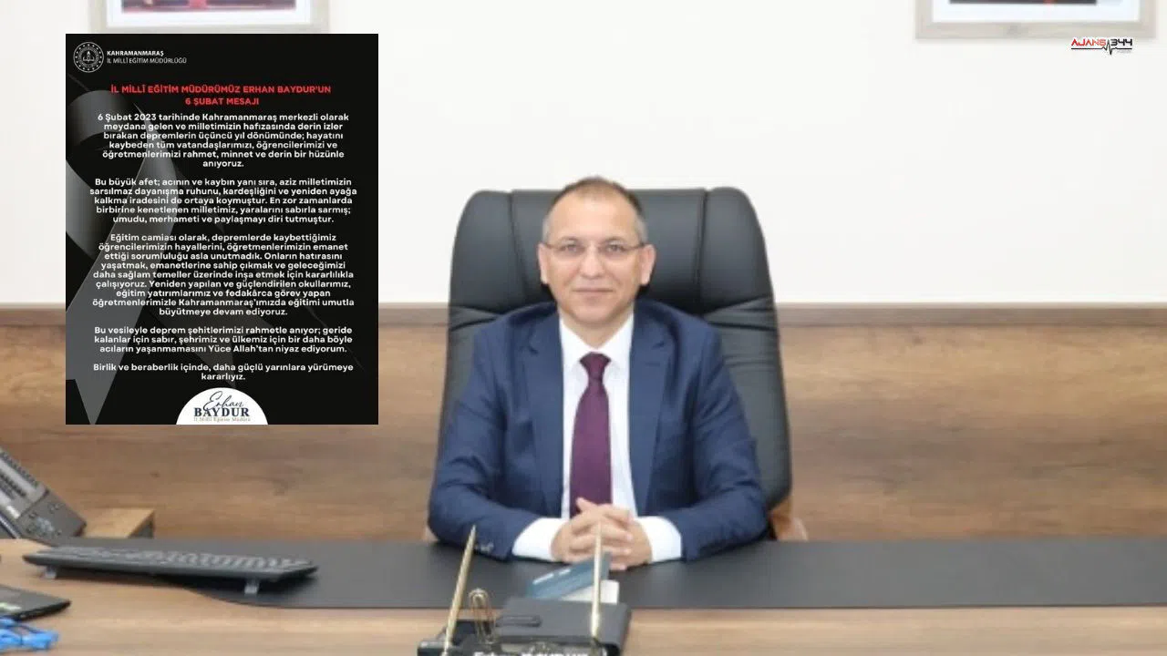 Kahramanmaraş İl Millî Eğitim MüdürüBaydur, mesajında 6 Şubat 2023’te Kahramanmaraş merkezli olarak meydana gelen depremlerin milletin hafızasında derin izler bıraktığını ifade ederek, hayatını kaybeden tüm vatandaşların, öğrencilerin ve öğretmenlerin rahmet ve minnetle anıldığını belirtti.