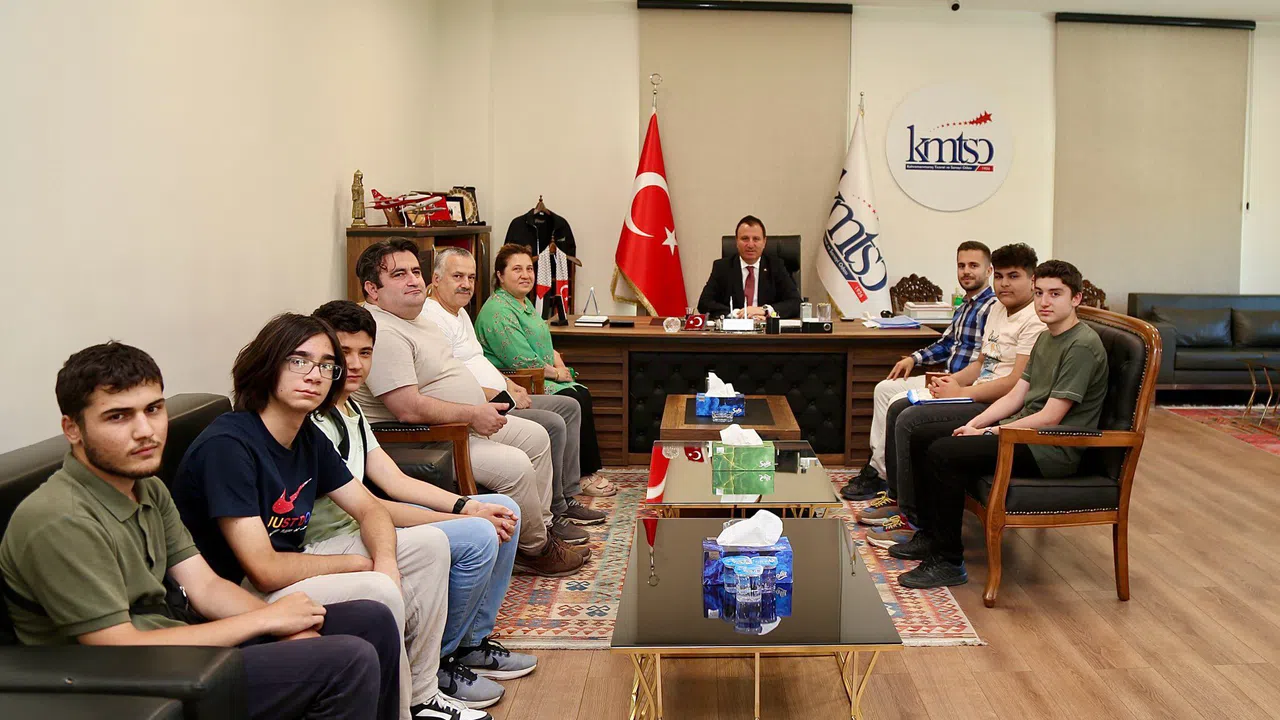 Kahramanmaraş Ticaret ve Sanayi Odası (KMTSO) Yönetim Kurulu Başkanı Mustafa Buluntu, TEKNOFEST 2025 Roket Yarışması’nda finale kalma başarısı gösteren Pusula Roket Takımı üyelerini ve T3 Vakfı Kahramanmaraş İl Sorumlusu Muhammed Mahfuz Erkan’ı makamında ağırladı.