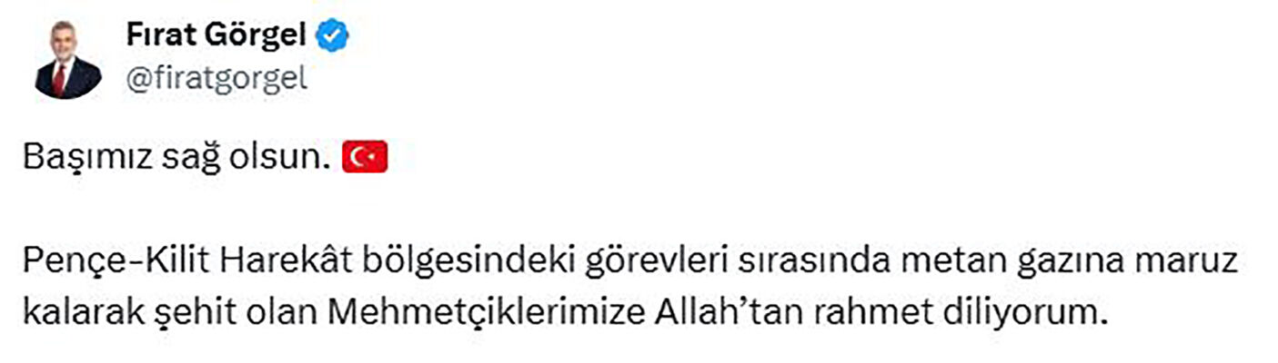 Kahramanmaraş Büyükşehir Belediye Başkanı Fırat Görgel, Pençe - Kilit Harekâtı bölgesinde bölücü terör örgütü mensuplarınca kullanılan mağaradaki arama tarama faaliyetinde metan gazından etkilenerek şehit olan kahraman Mehmetçikler için taziye mesajı yayımladı.